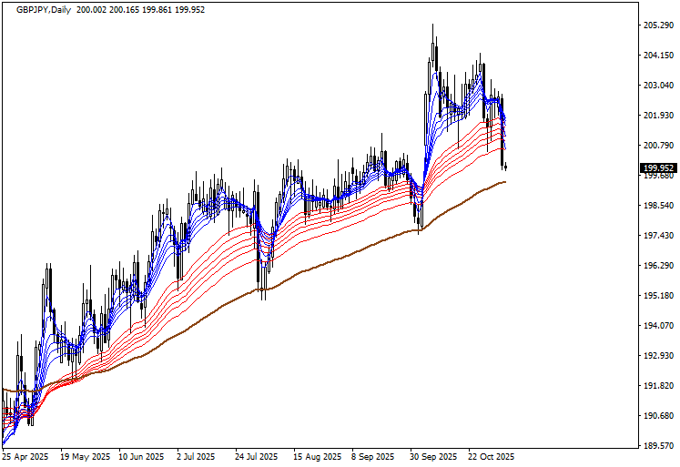 大台の200円を割って長期EMA群を実体で下抜けており、このままいけば下のEMA100を目指す展開になりそうです。