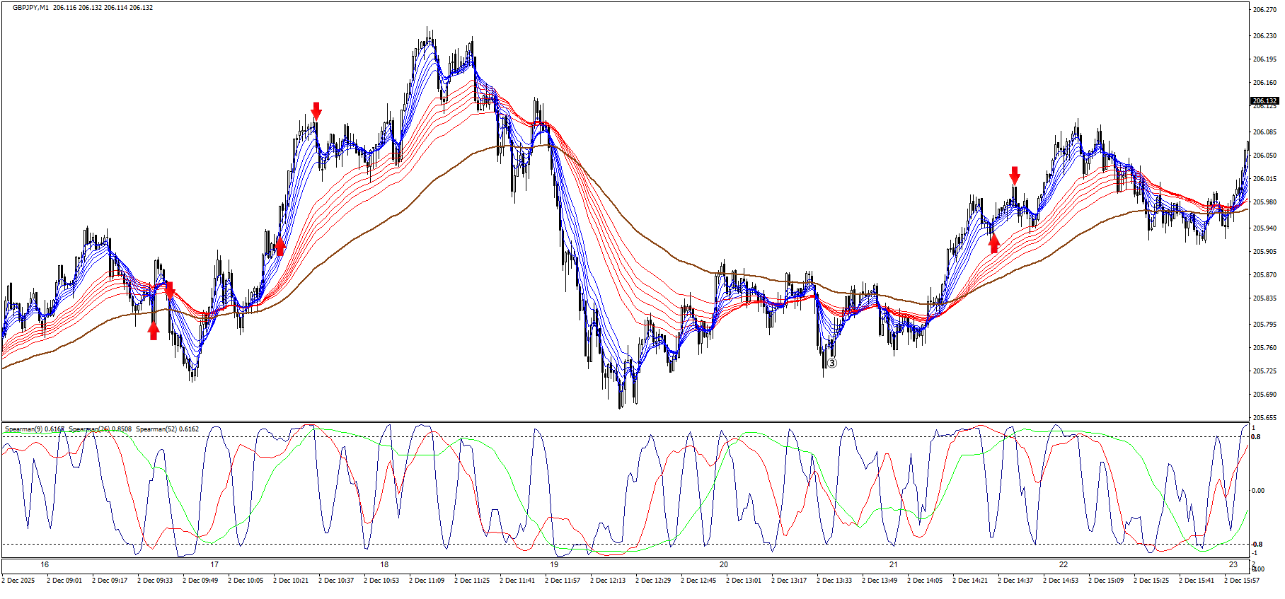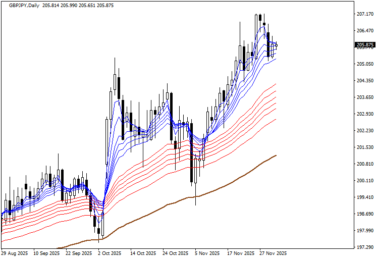 昨日の足は、その前日の大きな陰線内にはらまれていて、さらに短期EMA群内で推移しています。