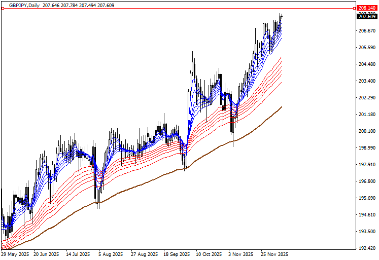 短期EMA群に絡みつく動きから頭一つ抜け出ています。