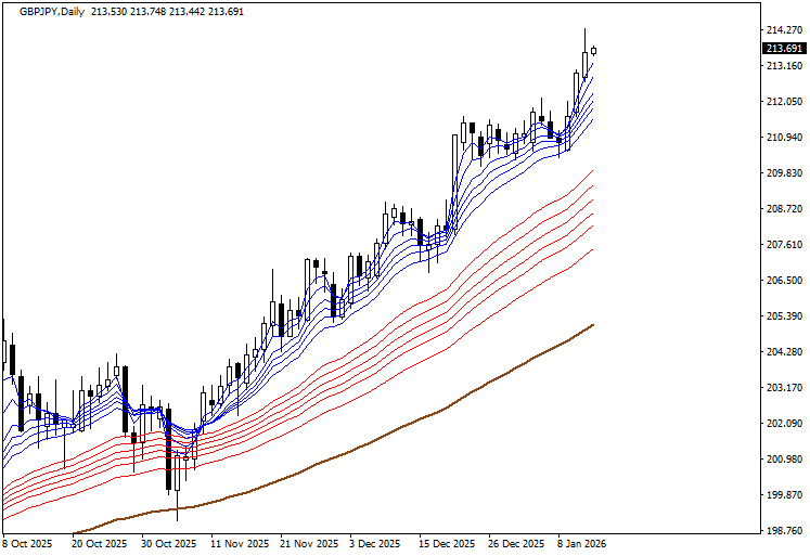 年明けからレンジが続いてボラの小さい相場が続きましたが、金、月、火と大きな陽線が連続して更に高値をブレイクしていっています。