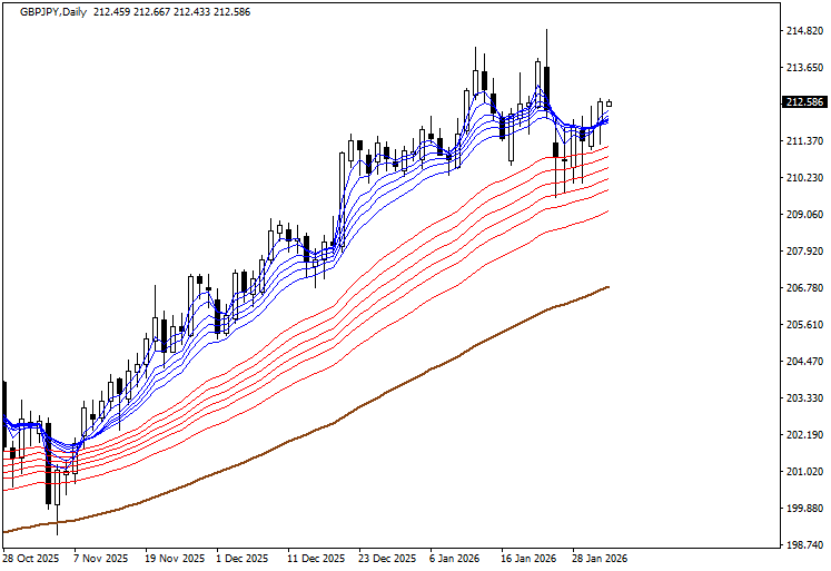 先週はずっと長期EMA群と短期EMA群の中で上下していたわけですが、昨日になって上をブレイクしてきました。