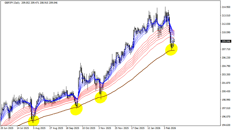 現在はEMA100にサポートされて長期&短期EMA群に上を抑えられている状況です。