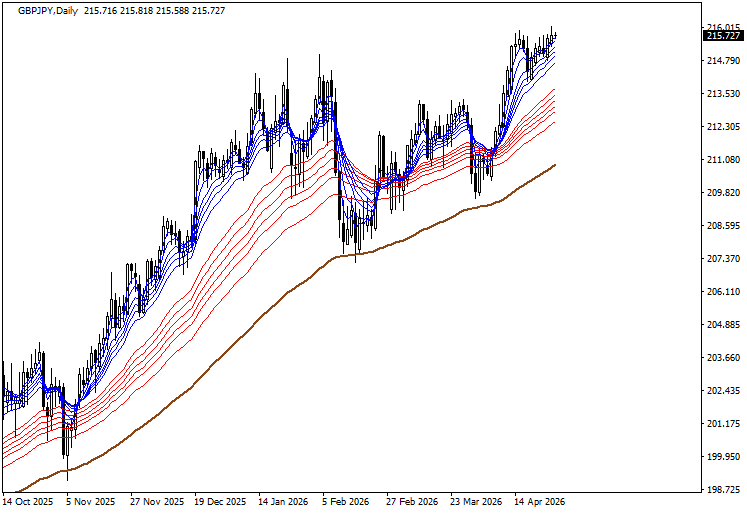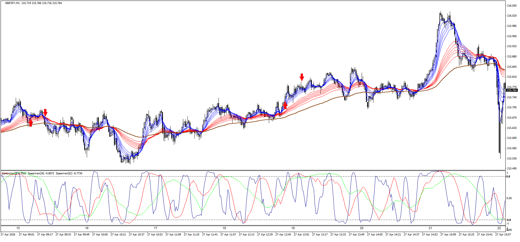 現状は引き続きローソク足が短期EMA群に絡んでいるところです。